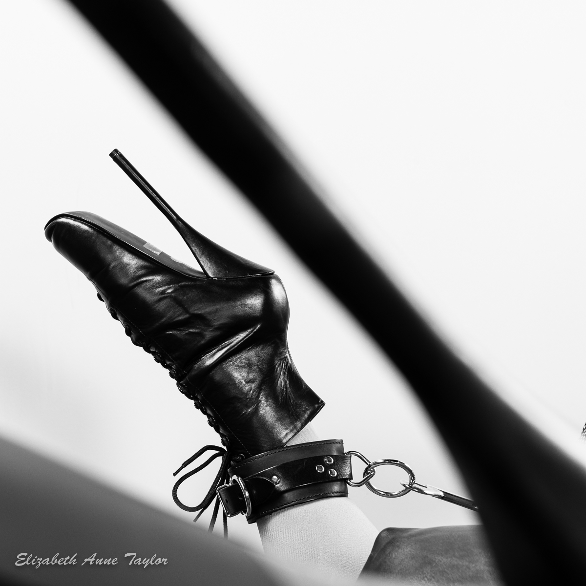 Dana donned her ridiculously high heel boots and couldn’t take another step. Leather cuffs adorned her wrists and ankles. She readily agreed to be bound to the spanking bench to show off her eight inch heels. What a dream for a fetish crossdresser like Dana!